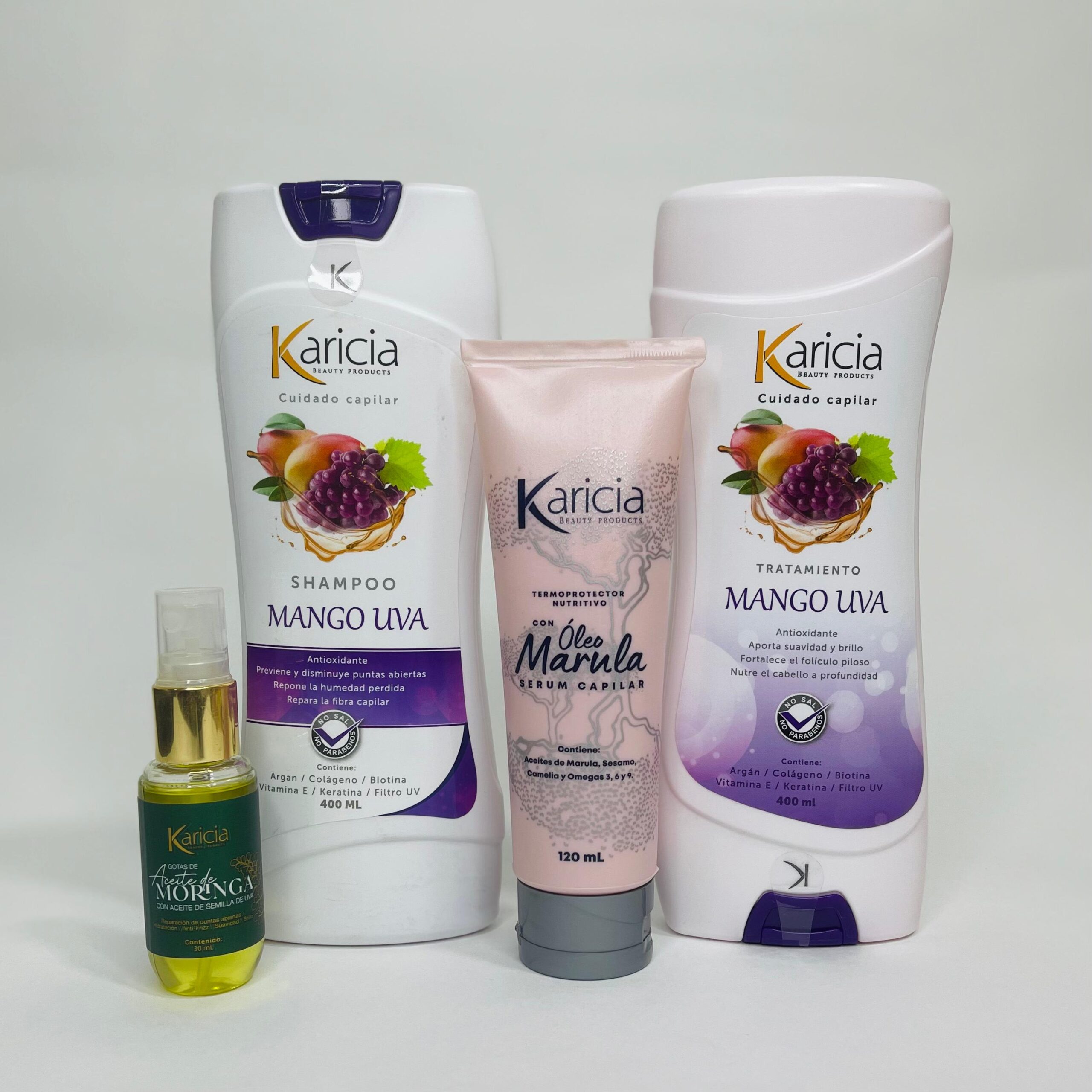 Este Kit Capilar para Cabello Seco incluye shampoo y tratamiento de mango y uva, termoprotector de marula y aceite de moringa, todo diseñado para hidratar profundamente y combatir el frizz. 🥭🍇✨