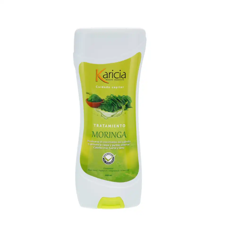 El Tratamiento de Moringa Karicia está hecho a base de moringa, conocido también como la planta de la vida. Promueve el crecimiento del cabello, combate la caspa, disminuye puntas abiertas y mantiene el cabello más sano, fuerte, es antioxidante y fortalece el folículo piloso. Estos productos están enriquecidos con moringa, pantenol, vitamina E, aloe vera y filtro UV.